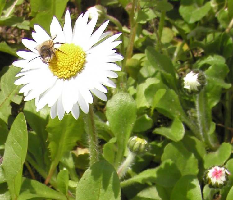 Alpenmaßliebchen Blüte mit Biene (Bitte hier klicken um dieses Bild in seiner vollen Größe zu betrachten)
