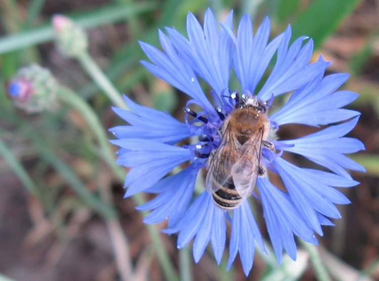 Eine Wegwartenblüte mit Biene (Bitte hier klicken um dieses Bild in seiner vollen Größe zu betrachten)